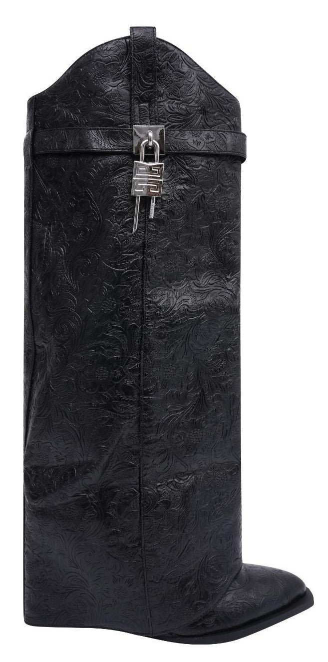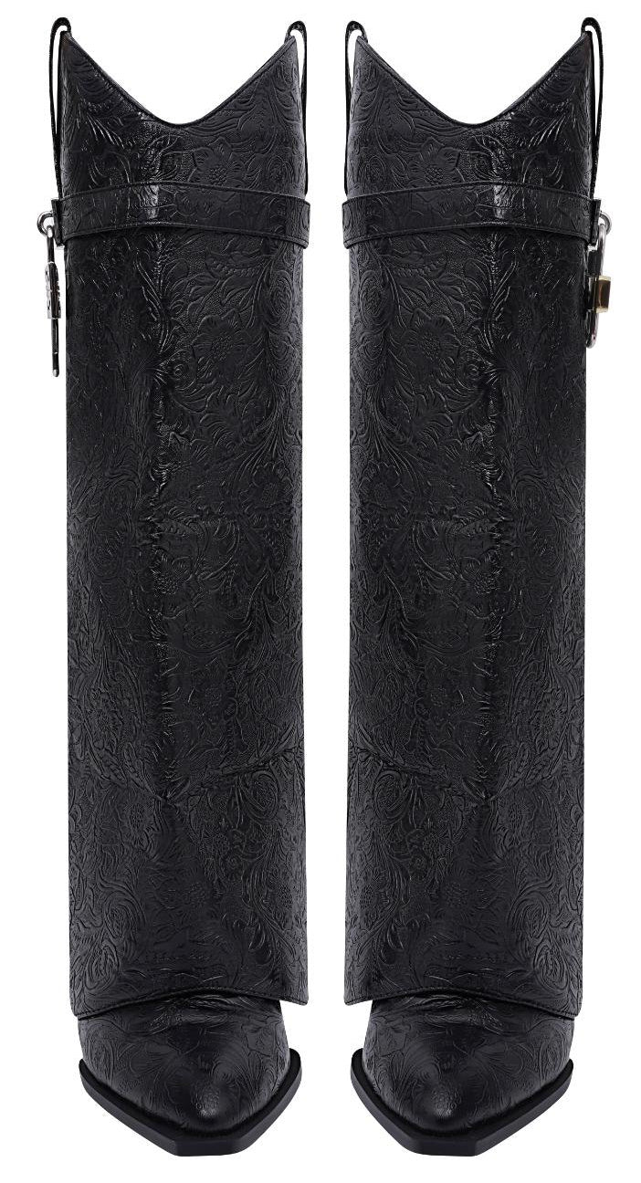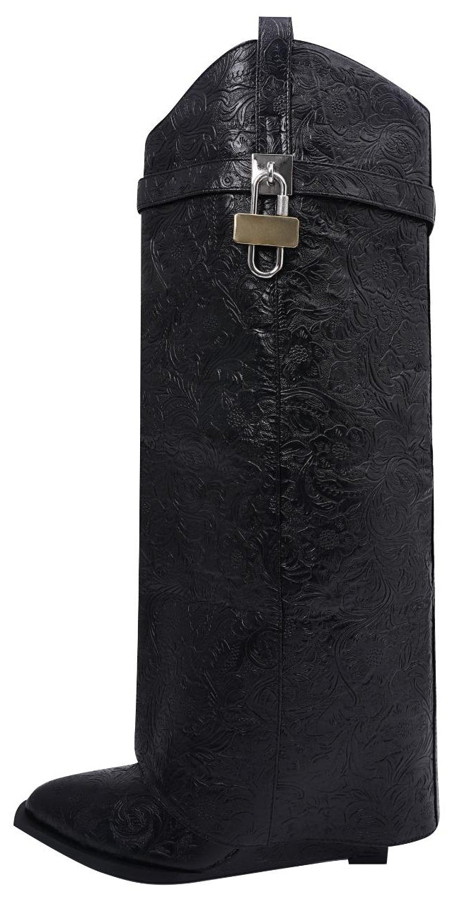 Osez affirmer votre style avec ces bottes hautes au design unique. Leur silhouette épurée, habillée d’un tissu texturé, est sublimée par un cadenas métallique signature qui attire le regard et apporte une touche de sophistication.