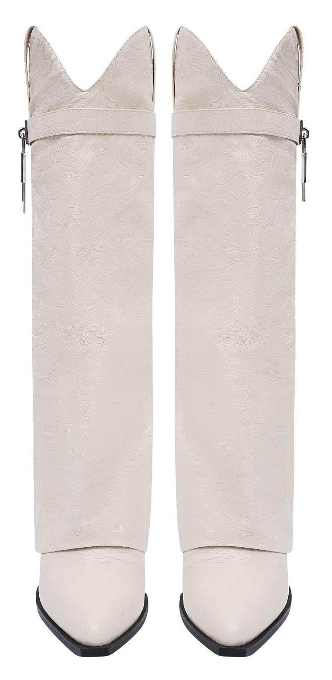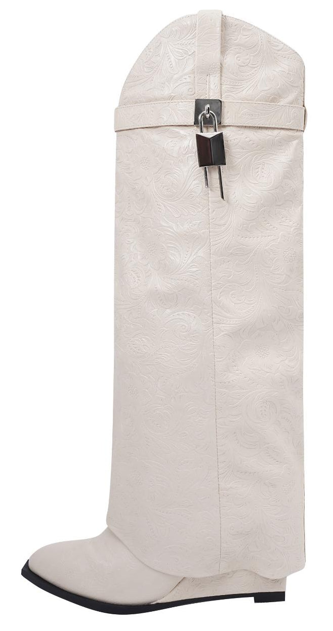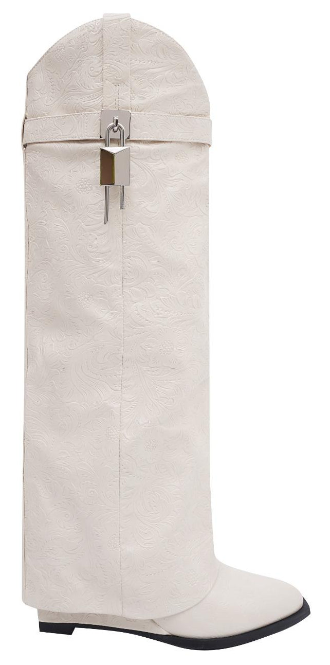 Osez affirmer votre style avec ces bottes hautes au design unique. Leur silhouette épurée, habillée d’un tissu texturé, est sublimée par un cadenas métallique signature qui attire le regard et apporte une touche de sophistication.